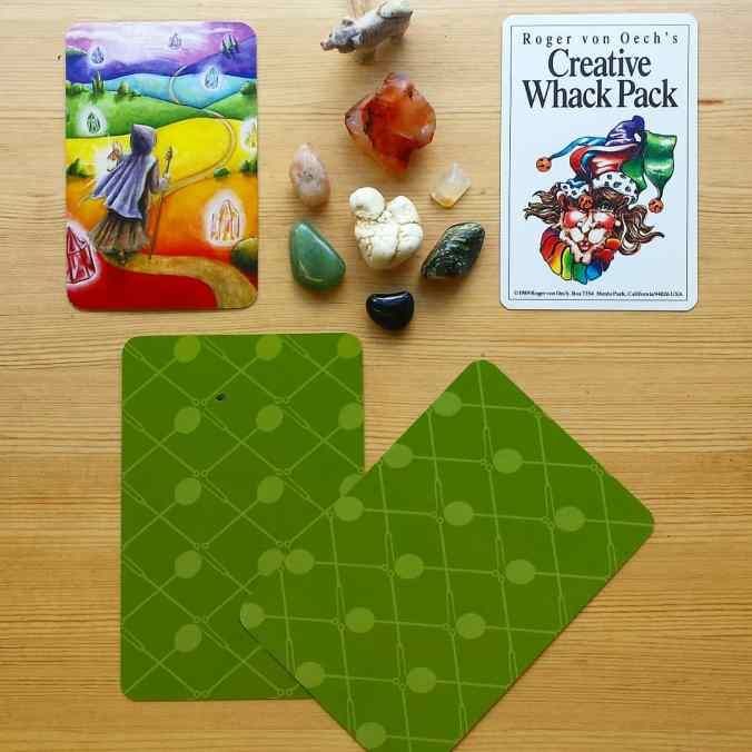 This reading is drawn from Chakra Wisdom Oracle Cards, Creative Whack Pack, and the Cook’s Tarot. I laid out a crystal grid of a dolomite bear to bring in an energy of nurturing protection, a big raw carnelian for pure creative energy and emotional understanding, sunstone to bring in the sun’s energy of vitality and light, moonstone to bring in the moon’s energy of understanding cycles and personal patterns, a large magnesite to keep you thinking clearly and connectedly, aventurine to open your heart and welcome in abundance, serpentine for further understanding of your personal patterns and your relationship with the magic of life, and black onyx for deep grounding and protection of your personal energy.